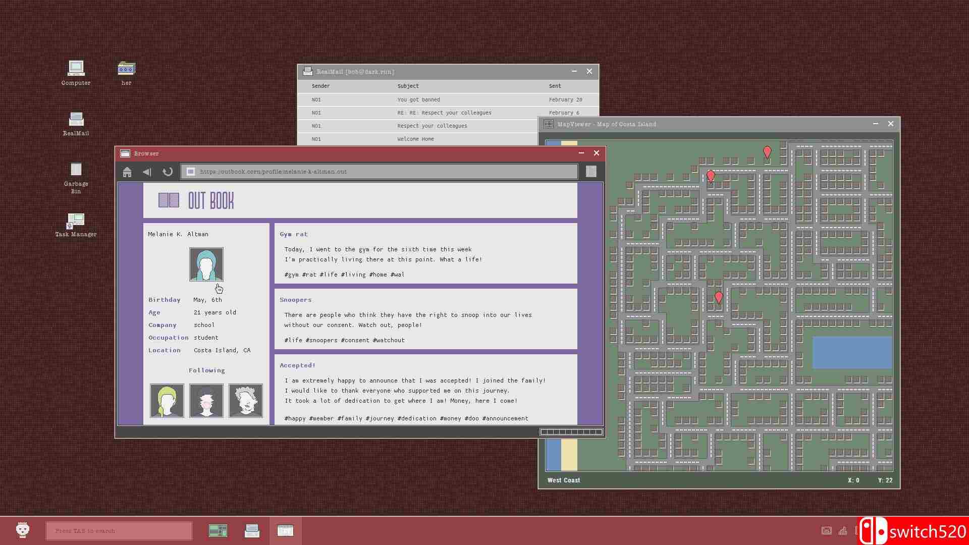 《网络战士》是一款模拟经营类(SIM)游戏,《网络战士》是一款黑客模拟游戏,你将扮演 Cyber Bureau of Intelligence(虚构的网络情报局)的一名特工,负责追捕日益猖獗的黑客组织 Dark Omega,阻止他们的犯罪行为并夺回被盗资金。在这个虚拟世界中,你要穿梭于数十个交互式桌面与 200 多个游戏内网站,解谜、未加密密码、定制你的黑客工具,并做出一系列将塑造新网络时代的决策。switch520
